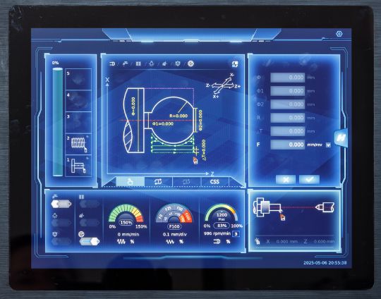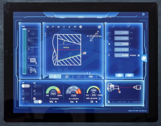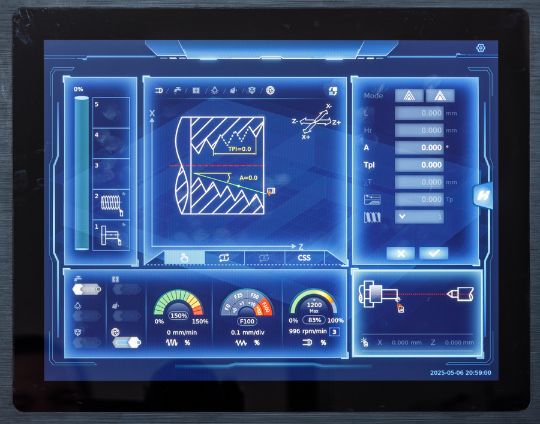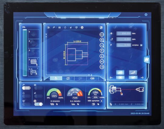 Процесс обработки легко контролировать в реальном времени. Дисплей отображает текущие скорость вращения шпинделя, величины подач, направление движения суппорта и нагрузки на привода.